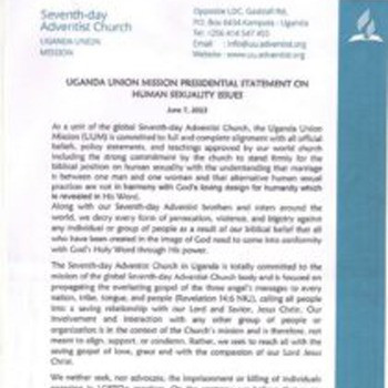 Президент Угандійської уніонної місії доктор Мозес Мака 8 червня 2023 року виступив із заявою з приводу поточної глобальної дискусії, пов'язаної з новим законом, який нещодавно був прийнятий в країні. (Угандійський закон під назвою «Антигомосексуальний акт» посилив відповідальність за одностатеві стосунки аж до смертної кари. США уже виступили з критикою нового закону і загрожували економічними санкціями через його прийняття – прим.ред.). Оскільки ця заява представляє міжнародний інтерес, ми наводимо її тут, а також надаємо посилання на її оригінальну публікацію на вебсайті Угандійської уніонної місії.