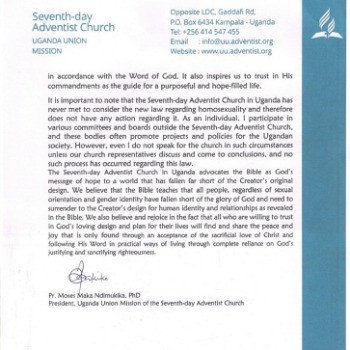 Важливо зазначити, що церква Адвентистів сьомого дня в Уганді ніколи не збиралася для розгляду нового закону про гомосексуалізм і тому не вживає жодних дій з цього приводу. Як приватна особа, я беру участь у різноманітних комітетах та радах поза церквою Адвентистів сьомого дня, а ці органи часто трапляється просувають проєкти та політику для угандійського суспільства. Однак, в таких обставинах, навіть я не висловлююсь від імені церкви, аж поки наші церковні представники не обговорять питання та не прийдуть до певного висновку, а такого процесу щодо цього закону не було.